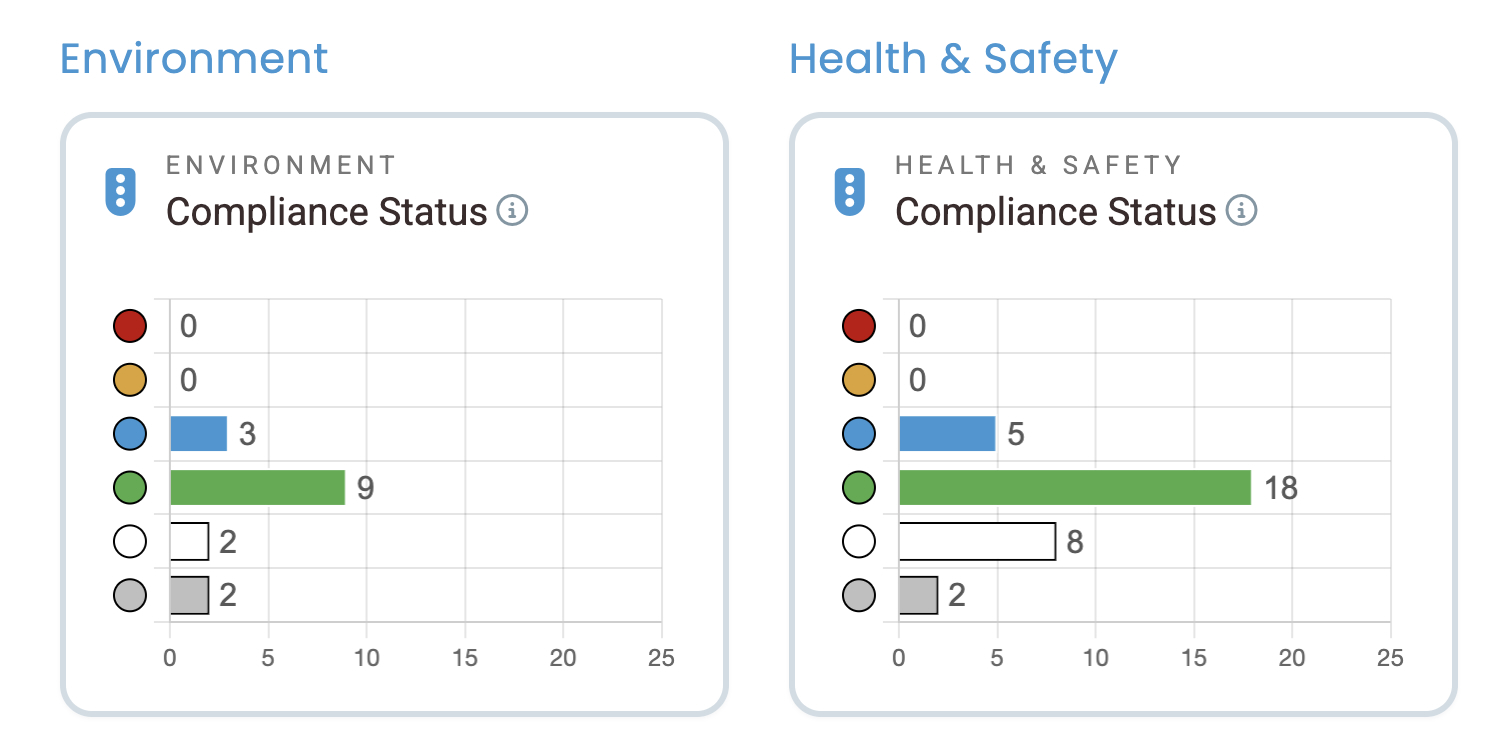 In the example above, there is 1 entry in each register that needs to be reviewed. Clicking on the grey bar will take you directly to the list of any entries which do not currently have a status set for review. Additional information on how to set the relevance of legislation, applying a traffic light status, adding comments and actions can be found here.