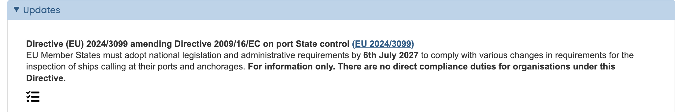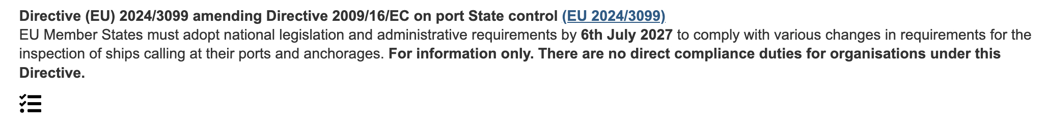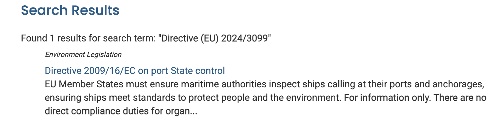 For example, if we search on LUS for “Directive (EU) 2024/3099” it will show us 1 result for the entry covering Directive 2009/16/EC on port State control. In this example Directive (EU) 2024/3099 doesn’t have its own entry, as it just amends the 2009 Directive.
